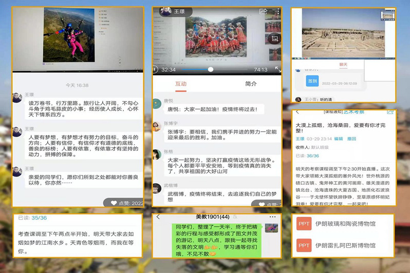 学期初,学院领导多次组织各教研室开展教学研讨,结合当前防疫要求制定了省内、市内和线上三套考察预案。3月14号,结合全国和省内疫情防控的形势发展,学院领导做出启用线上考察方案的决定,各任课教师积极完善线上课程。3月21日,一场独特又奇妙的线上艺术考察之旅正式“启程”。老师们利用自制的精美课件、图文并茂的游记、纪录片视频等多种教学资源,运用同步课堂、直播、主题讨论等多样教学方式,使用三毛游App、虚拟博物馆、马蜂窝等信息化教学手段,向同学们生动介绍不同考察路线上的风土人情和文化艺术传承情况。为了给封闭管理的学生带来更多的温馨与暖意,老师们的授课通知和作业都充满着诗情画意。大家在虚拟空间尽情遨游,畅所欲言,完成了一篇篇精彩的考察日志,4月1日本次奇妙的线上艺术之旅圆满收官。