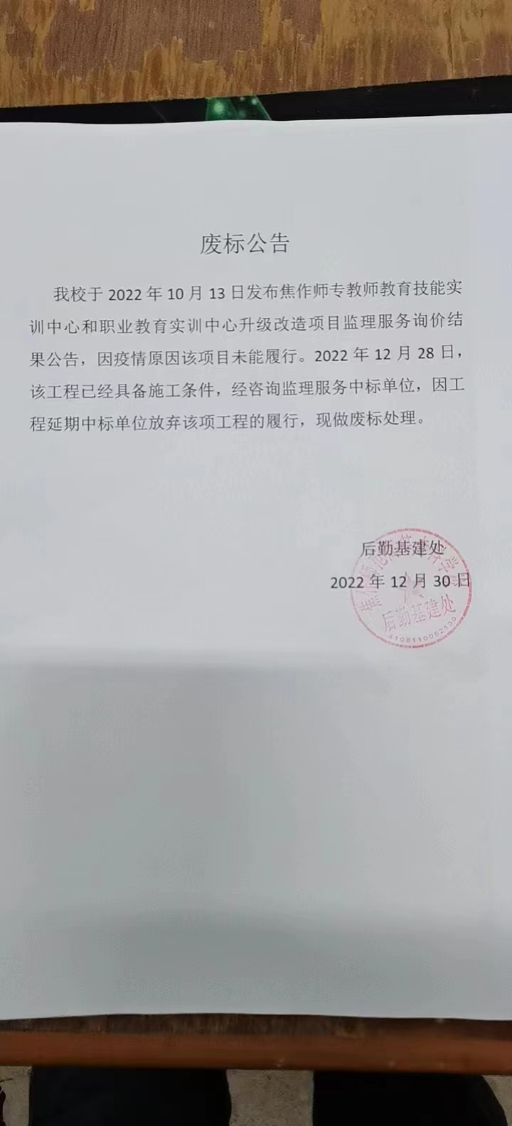 我校于2022年10月13日发布焦作师专教师教育技能实训中心和职业教育实训中心升级改造项目监理服务询价结果公告,因疫情原因该项目未能履行。2022 年12月28 日该工程已经具备施工条件,经咨询监理服务中标单位,因工程延期中标单位放弃该项工程的履行,现做废标处理。