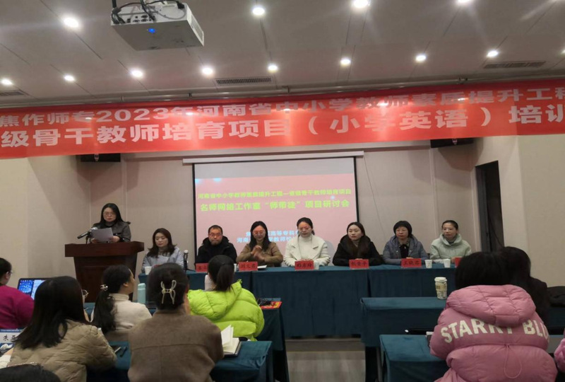 12月21日上午,河南省小学英语骨干教师培训项目“师带徒”教学研讨会召开。会议由焦作市焦东路小学张丹老师主持,开封市横堤铺小学靳歆老师作为教师代表发言,焦作师专外语经贸学院李欣老师对“师带徒”工作做了详细的说明。四位省级名师和49名参加培训的老师参与了此次“师带徒”会议。