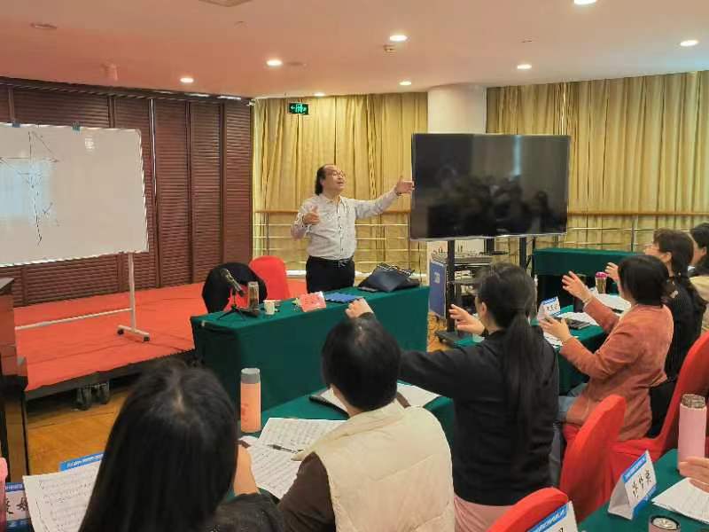 3月27日,在三维戴斯酒店三楼会议室,河南理工大学音乐学院的副院长马安平为参加省级骨干教师培训的学员们带来了《合唱指挥技法及实训运用》的培训课程。