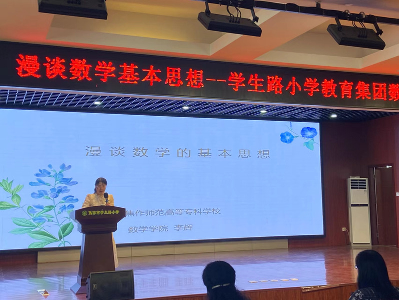 5月9日,学校小学数学名师工作室成员、数学学院教师李辉,受邀为焦作市学生路小学教育集团做《漫谈数学的基本思想》专题培训。