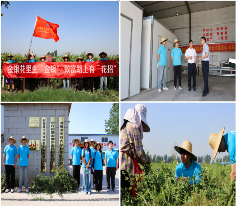 近日,学校大学生创新团队在招生就业处柴炜嘉、张冬丽和耿英伟三位指导老师的带领下,走进新乡封丘金银花种植基地,开展“青年红色筑梦之旅” 专项活动和“我敢闯,我会创”为主题的社会实践活动。