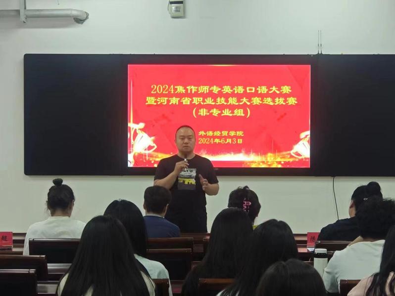 为提高学生英语口语表达能力,激发学校非英语专业学生学习英语的积极性,同时也为河南省职业技能大赛选拔参赛选手,6月3日下午,由教务处主办、外语经贸学院承办的2024年焦作师专英语口语大赛暨河南省职业技能大赛选拔赛(非专业组)决赛在2教101教室举行。