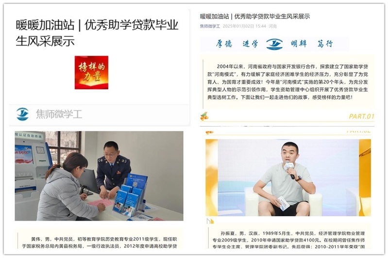选树优秀贷款毕业生典型。今年是我省高校助学贷款开展20周年,为充分发挥先进典型的榜样引领作用,各学院积极选树优秀贷款毕业生典型,广泛宣传他们诚信还款、自立自强的品质。