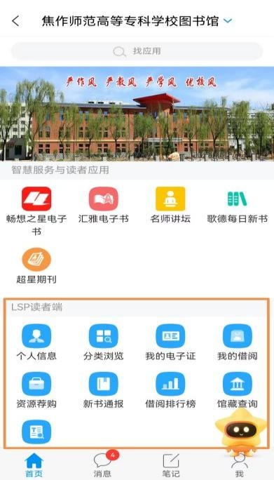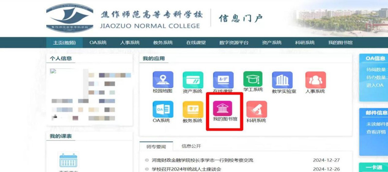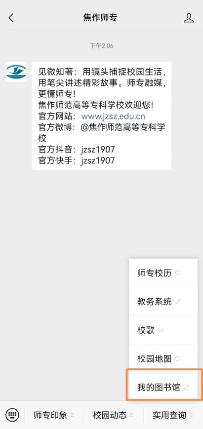 ③微信端:关注“焦作师专”微信公众号,点击实用查询---我的图书馆,即可在微信端进行馆藏查询等操作,点击“个人信息”或右下角“导航”进行登录。