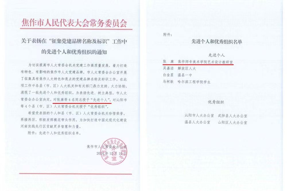 近日,焦作市人大常委会举行了机关党建品牌名称和标识征集活动。美术学院教师张康的设计方案被正式采纳。同时,该教师也被评为此次征集活动先进个人。