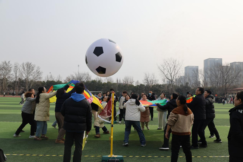 集体项目现场更是热闹。“彩虹趣颠球”项目由10名教工围成一圈,齐心协力拽紧“彩虹网”,听到“一二三起!”的口令后,同时发力向上抛“球”。巨大的充气足球被彩虹网击“飞”向空中,徐徐落下后,然后又被“彩虹”“颠”起。参加“龙行万里”的选手们也不甘示弱,他们喊着整齐的口号,奋力蹬地,龙舟如离弦之箭般冲向终点。现场观众也被选手们的精彩表现所感染,加油声、欢呼声此起彼伏,将比赛气氛推向高潮。