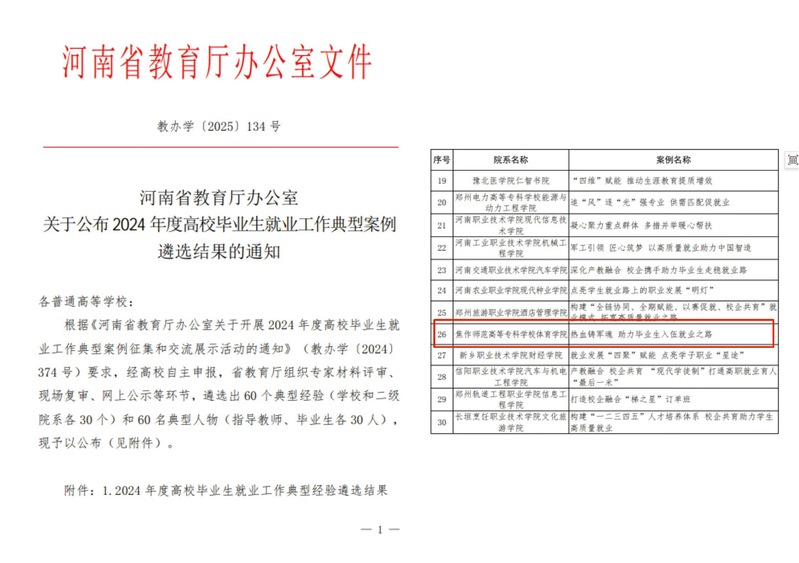 近日,河南省教育厅公布了2024年度高校毕业生就业工作典型案例遴选结果,学校体育学院申报的《热血铸军魂·助力毕业生入伍就业之路》从全省众多申报案例中脱颖而出,成为入选30个典型案例(二级学院)之一。