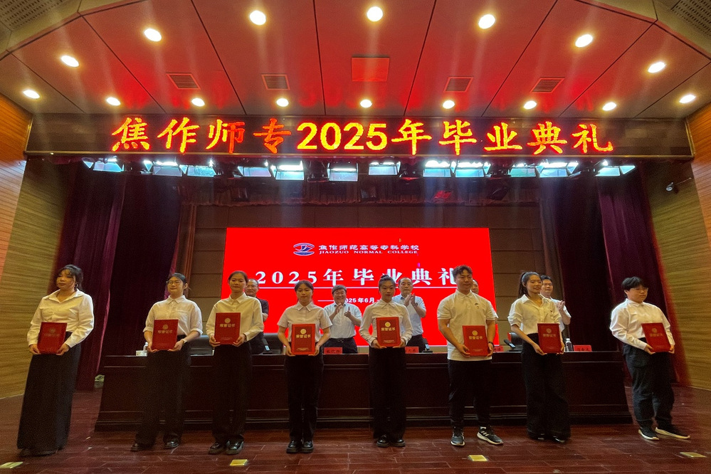 上午9时,典礼开始。全场起立,高唱国歌。王静锋宣读了学校《关于颁发2025届全日制专科毕业生毕业证书的决定》,王红艳宣读了学校荣获“2025年河南省普通大中专学校优秀应届毕业生”学生名单。校领导共同为2025届毕业生代表颁发毕业证书,为省级优秀毕业生获得者代表颁发荣誉证书。