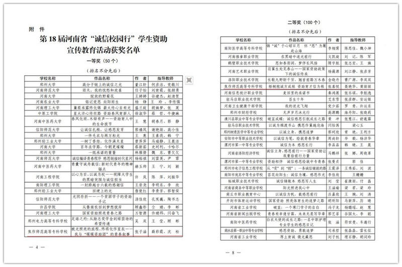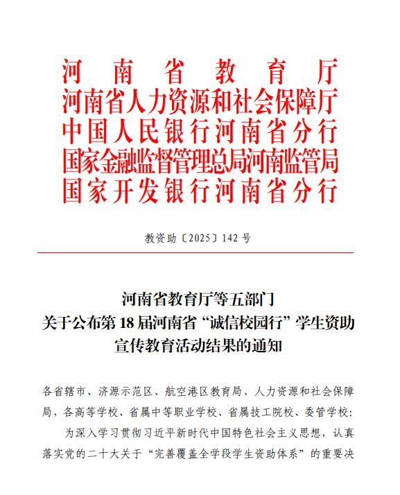 近日,河南省教育厅等五部门公布了第18届河南省“诚信校园行”学生资助宣传教育活动结果,学校选送的作品《被光照亮的旅程,终将化作星辰——我与“暖暖资助团”的青春叙事》和《梧桐抱诚方成栋 资助育才信为根》分别荣获一等奖和二等奖佳绩!这是继去年河南省“诚信校园行”学生资助公益广告设计大赛后,学校再次在河南省“诚信校园行”学生资助活动中荣获佳绩。