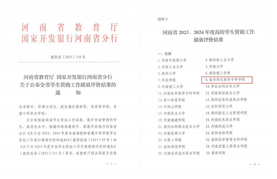 日前,河南省教育厅、国家开发银行河南省分行印发了《关于公布全省学生资助工作绩效评价结果的通知》(教资助〔2025〕158号)。我校再获佳绩,被确定为“优秀”等级。学校申报的《资助赋能启心启程——阳光关爱行动资助育人项目》被认定为学生资助工作创新项目。