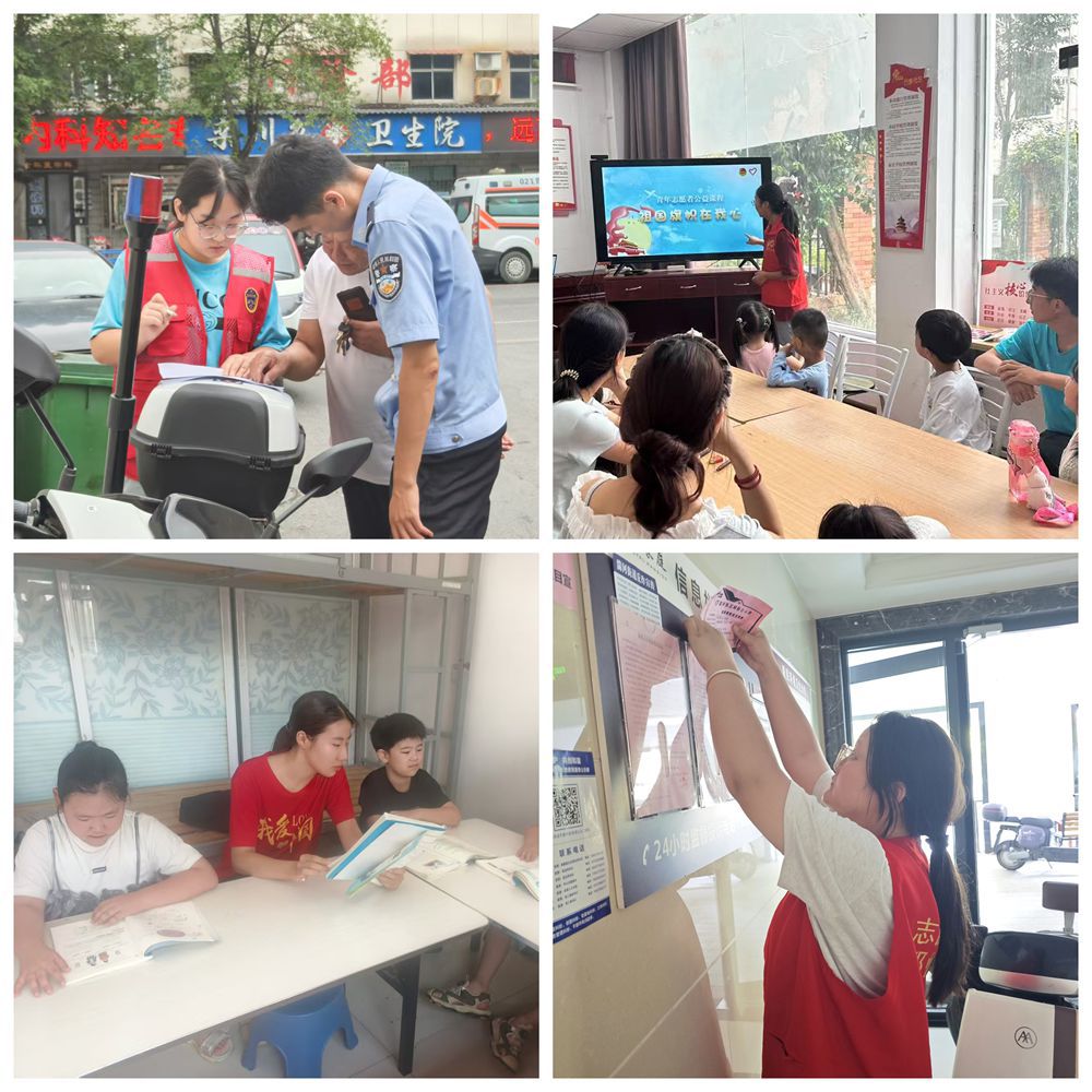 团队成员围绕社区群众关心的领域,根据社区的居住环境与人文环境开展志愿服务,确保每一次活动都能落地有效。大家先后前往洛阳市栾川县城关镇派出所协助社区民警开展“全民反诈在行动”反诈宣传教育志愿服务;前往汝州市西东社区和永城市酂阳镇温馨社区开展“爱护环境,从我做起”社区环境卫生整治志愿服务;前往滑县锦和社区开展“携手成长相伴,阳光爱心辅导”志愿服务;前往濮阳市朝阳社区开展“清理小广告,文明伴我行”志愿服务;前往平顶山市蓝湾社区开展“珍爱生命,严防溺水”志愿服务;前往西安市御锦城社区开展“亲情问候,爱心陪伴”志愿服务;前往伊川县平等乡文化书屋开展“文明实践,我是行动者”图书整理志愿服务;前往邓州市湍河街道御豪庭社区开展“小楼道,大文明”楼道卫生清洁志愿服务;前往许昌市魏都区万象社区开展“七彩假期”儿童关爱志愿服务。团队成员走进基层、服务基层,了解社会实际、服务人民群众、增强时代责任感,在社区实践中厚植家国情怀、挺膺担当作为,将爱国情、强国志融入赋能基层治理的实际行动中。
