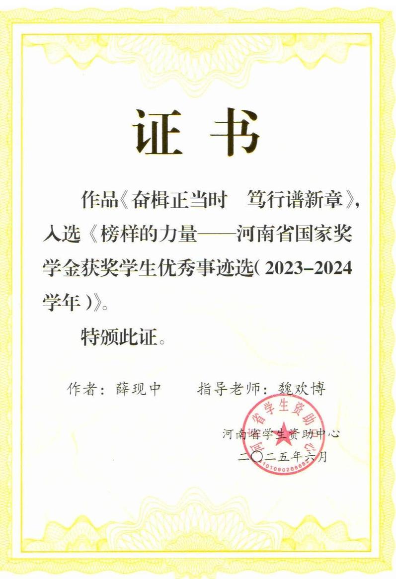 近日,河南省国家奖学金获奖学生优秀事迹《榜样的力量》刊印。《榜样的力量》从2023-2024学年度全省10191名国家奖学金获奖学生申报资料中遴选出100篇特色鲜明、亮点突出、具有一定代表性和导向作用的事迹材料,其中专科生30篇,数学学院金融2201班学生薛现中的事迹被成功选录。