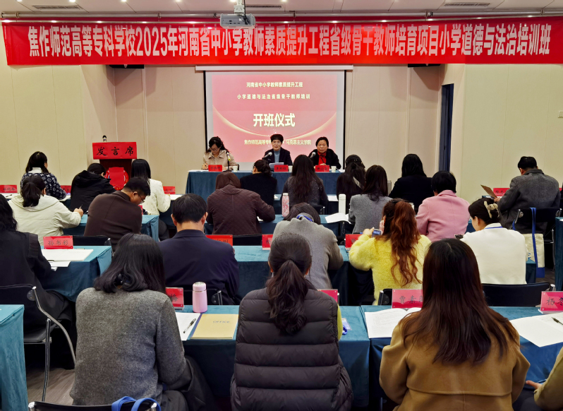 10月29日上午,河南省2025年中小学素质提升工程——小学道德与法治省级骨干教师培育培训班,在焦作市凯悦大酒店九楼会议室顺利开班。马克思主义学院院长、首席专家李彩红,项目统筹负责人韩小荣、马克思主义学院副院长原瑞娟、本期培训班班主任及全体学员参加了开班仪式。