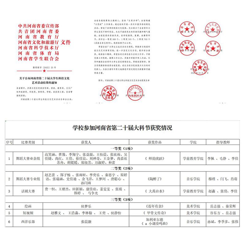 河南省大学生科技文化艺术活动由中共河南省委宣传部、共青团河南省委、河南省教育厅、河南省文化和旅游厅、河南省科学技术厅、河南省体育局、河南省学生联合会联合举办。旨在促进广大青年学生健康成长、培养大学生的创新精神和实践能力为导向,融科技、文化、艺术于一体的文化盛会,是衡量高校校园文化建设水平的重要赛事。本届大学生科技文化艺术活动自启动以来,学校高度重视,精心筹划,为参赛学生配备专业指导教师悉心指导,做好参赛作品的艺术创作、选拔、培训、排练等工作,遴选出高质量的作品参加省级决赛,取得了优异成绩。其中,舞蹈大赛业余组作品《师韵虎跃》荣获一等奖;舞蹈大赛专业组作品《陶醉了》和话剧大赛作品《大禹治水》荣获二等奖;绘画作品《连年有余》、短视频《甲骨文传奇》和西洋乐器加利亚尔德《a小调奏鸣曲》荣获三等奖。