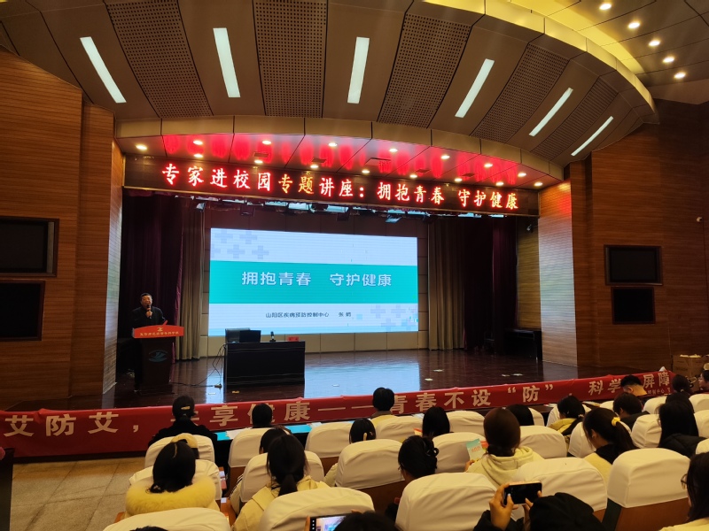 山阳区疾控中心副主任张娟从发生在学生身边的实例入手,捕捉高校学生生活细节,结合流行病学调查和临床数据,科学回答了艾滋病发生的原因、传播途径、预防措施、治疗手段和发生高危行为后应“早发现、早诊断和早治疗”的正确解决办法。