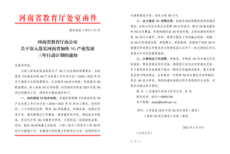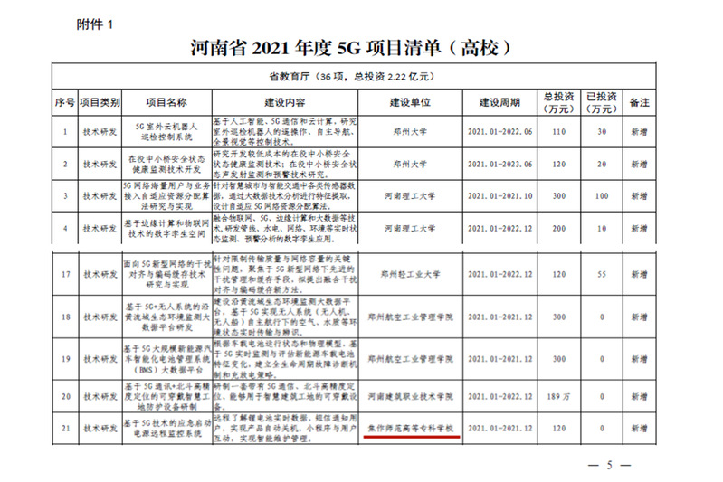 5G项目(高校)是省教育厅为深入贯彻省委省政府关于5G产业发展的部署要求,加快落实《河南省加快5G产业发展三年行动计划(2020-2022年)》关于教育行业的部署要求,面对省内高校开展的优先支持重点科研项目,本年度全省共立项36项,其中32项为郑州大学、河南理工大学等本科院校获得,高职高专院校仅有4所,我校是其中之一。这是对牛全营老师多年来从事科技研发工作的肯定和鼓励!希望我校广大教师向牛老师学习,潜心科技研发,产出高质量成果,为提高我校科技创新水平贡献力量!(文:王建志 审核:程峰)