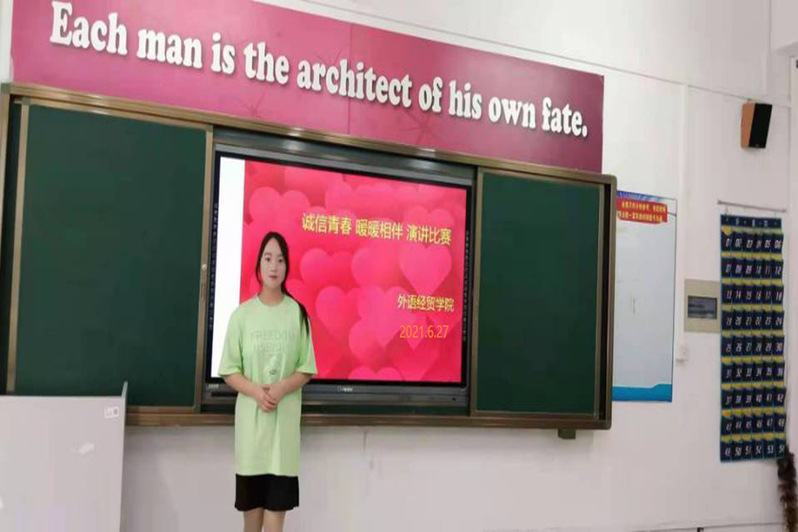 为庆祝中国共产党成立100周年,引导学生诚实守信、自立自强、感恩奉献、回馈社会,努力培养德智体美劳全面发展的社会主义建设者和接班人,外语经贸学院于6月27日晚在2教110教室举办“诚信青春,暖暖相伴”主题演讲比赛。