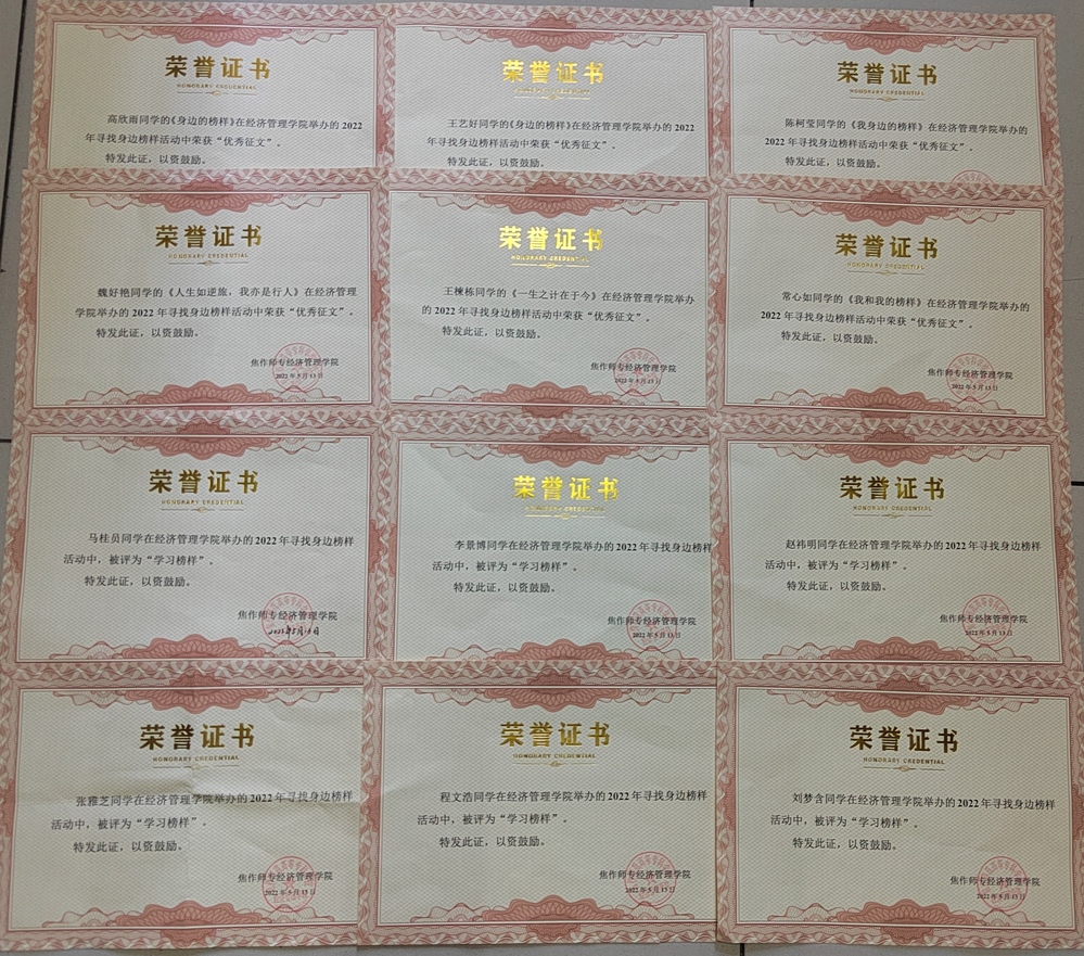 此次活动自2022年3月27日伊始,在学院、班级的大力宣传和精心组织下,各班级学生积极参与其中,全院掀起了“积极寻找榜样、努力效仿榜样、争做他人榜样”的活动高潮。截止5月15日结束,历时一个半月时间,共收到主题征文72篇和“身边榜样”材料25份,提及榜样人物达48人。经过评审小组多次筛选、讨论、评议,最终评选出优秀征文16篇,确立10名学生为“身边榜样人物”,同时制作展板在2号楼5楼大厅进行展出,供大家参阅学习。