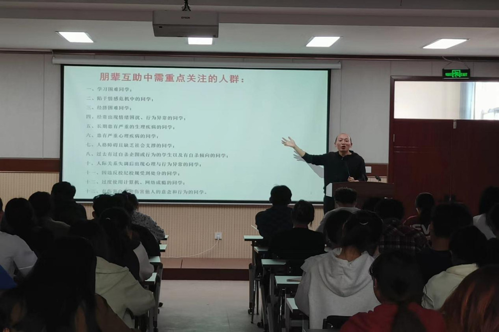 培训中,薛庄林详细介绍了朋辈辅导员的卡通形象代言人——星辰,引导同学们对心理委员角色的认同,鼓励做到“干一行爱一行”。阐述了大学生常见心理问题的识别和分类,朋辈互助中需重点关注的人群,在重要时间节点积极关注同学的明显变化和异常行为,做到早发现、早上报。并强调,心理委员要牢固树立心理健康意识,不断提高心理健康素质;认真学习心理健康知识,积极开展心理健康教育活动;充分发挥“守门员”的作用,切实提高心理危机的识别能力。