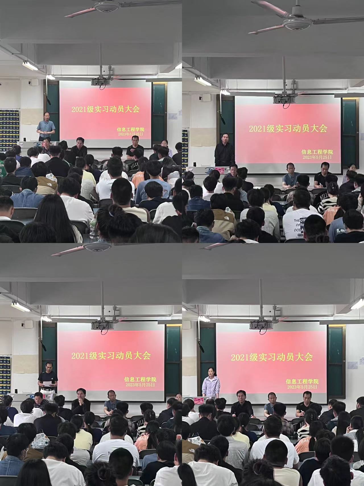在实习动员大会上,秦晓明首先宣读了《信息工程学院2021级学生实习工作方案》,对2021级学生实习工作进行具体部署,包括实习工作领导小组、实习时间、实习内容、实习手册、实习企业、实习注意事项等,介绍了相关校企合作企业,为学生提供充足的实习岗位。副院长谷利芬就实习教学提醒同学们充分利用好实习机会,应当着手准备接下来的学习或者就业,以及毕业设计答辩。接下来,副书记叶留青进行实习安全教育,要求同学们要服从学校和实习单位的双重管理,注意人身安全、财产安全、交通安全,防火防盗防诈骗等。最后,学院党总支书记尚晓星、院长米西峰分别对实习工作做了强调,要求学生严格遵守实习期间的各项规章制度,高质量完成实习任务。