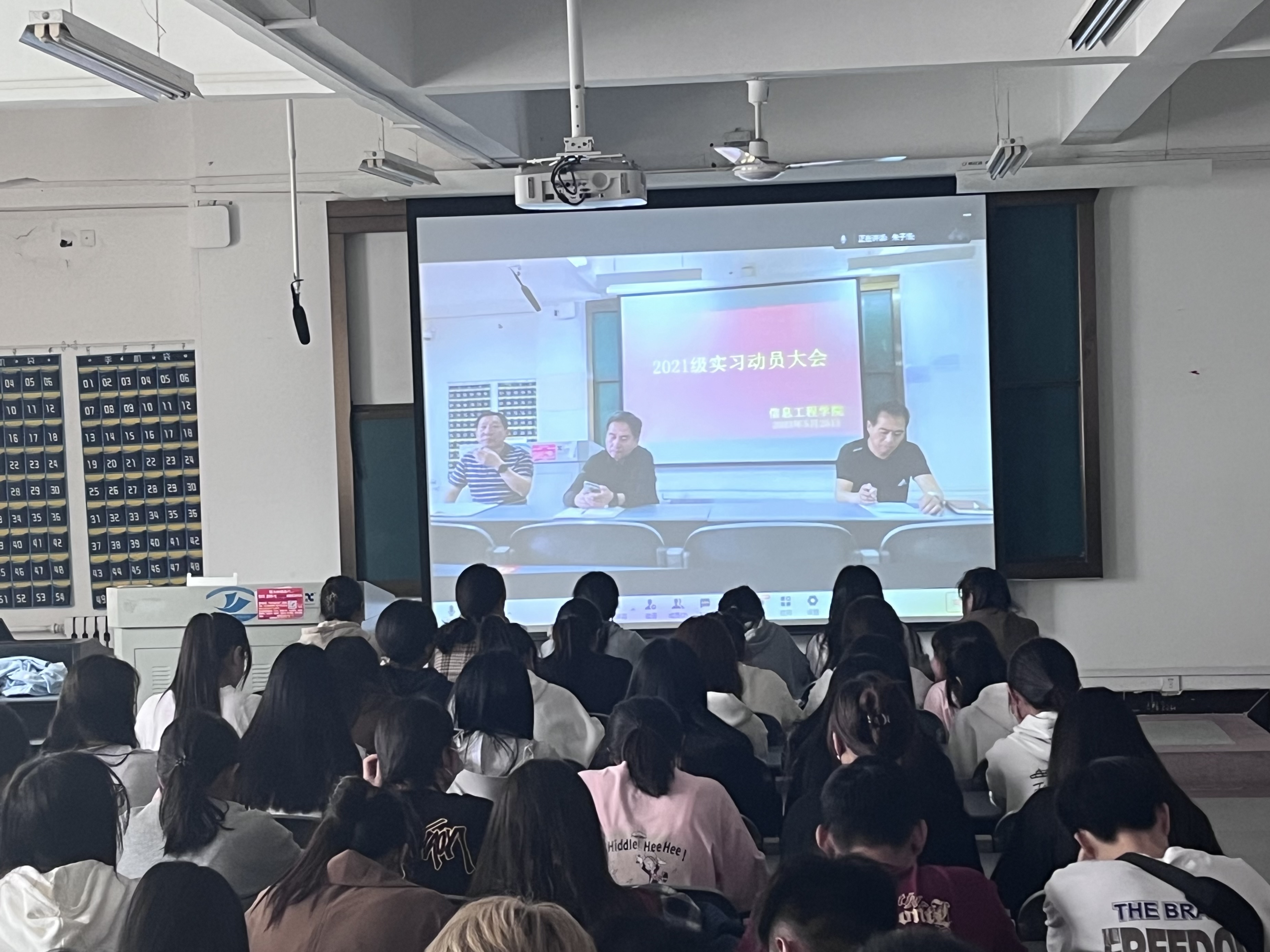 5月25日,信息工程学院召开2021级实习动员大会, 动员会采取直播方式,主会场设在2教312教室,分会场设在二教313教室,学院班子成员、教科办主任、21级辅导员班主任以及2021级318名学生全部参加了会议。会议由副院长秦晓明主持。