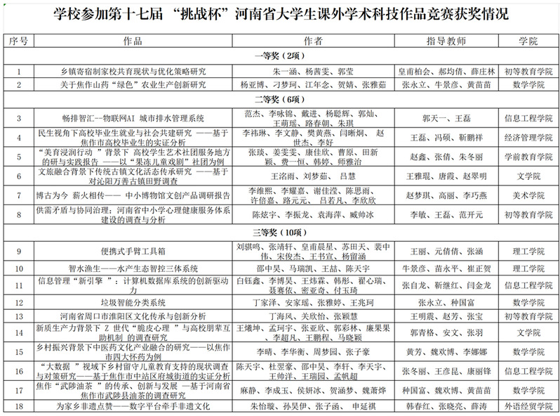近日,由共青团河南省委、河南省教育厅、河南省社会科学院、河南省科学技术协会、河南省学生联合会联合举办的第十七届“挑战杯”河南省大学生课外学术科技作品竞赛获奖名单公布。学校共有18件作品在本届“挑战杯”省赛获奖,其中一等奖2项、二等奖6项、三等奖10项。