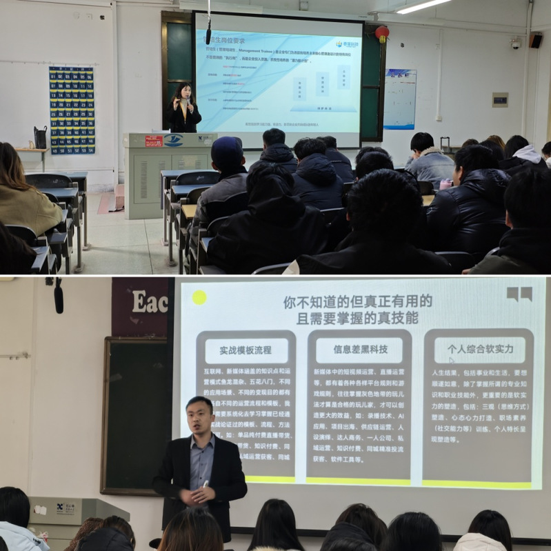 两家企业代表系统介绍了企业的发展历程、核心业务、办公环境、团队文化、人才需求等,并详细介绍了直播运营、跨境电商运营助理、短视频编导、新媒体推广专员、客服专员等岗位的职责要求与职业发展路径。