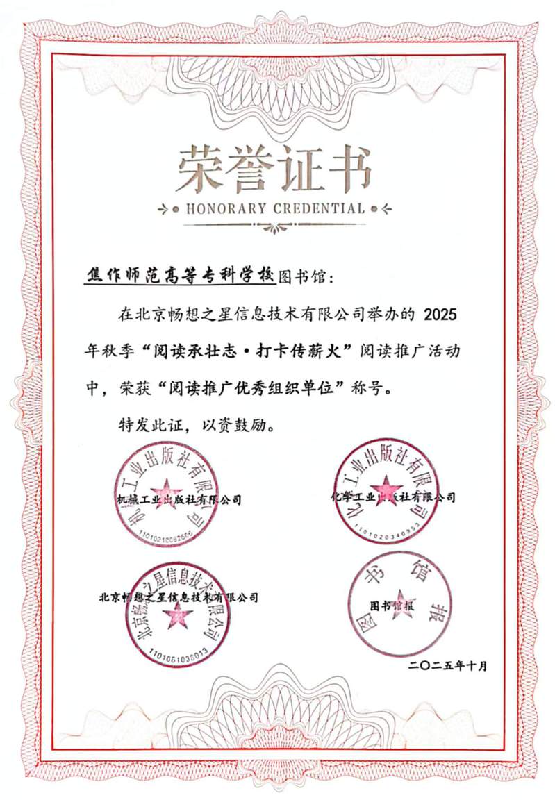 近日,北京畅想之星公布2025年“阅读承壮志·打卡传薪火”秋季阅读推广活动获奖名单,我校图书馆从全国三百余家参与单位中脱颖而出,被授予“阅读推广优秀组织单位”荣誉称号。