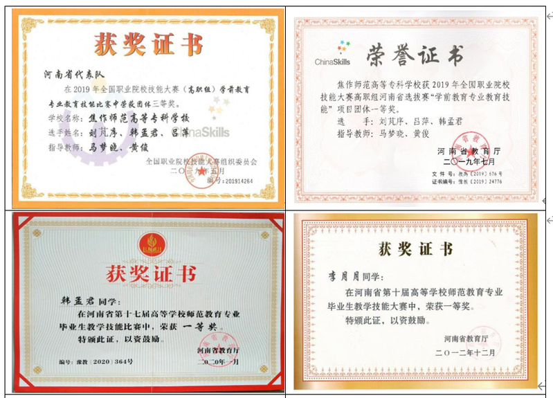 我校学前教育专业连续八年参加河南省师范类毕业生教学技能大赛荣获一等奖15项,特别是2016年以来,参赛选手一等奖获奖率达100%;2019年学前教育专业组队参加全国职业院校“学前教育专业教学技能”河南赛区选拔赛,获全省第二名并代表河南省参加全国职业院校高职组第三届“学前教育专业教育技能”大赛中荣获三等奖。
