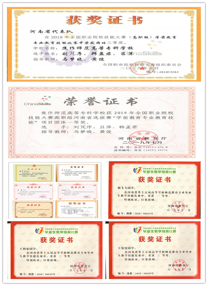 2010年到2019年参加河南省师范类毕业生教学技能比赛荣获一等奖17人。2014年11月,分别获得全省毕业生教学技能大赛一、二等奖。在2014年9月举行省第十四届大学生科技文化艺术节上,我院学生集体《舞风酥雨忆》获一等奖,集体《舞青青小树》获二等奖的好成绩。2019年全国职业院校技能大赛高职组河南省选拔赛一等奖,并代表河南省参加全国职业院校技能比赛获学前教育组三等奖。