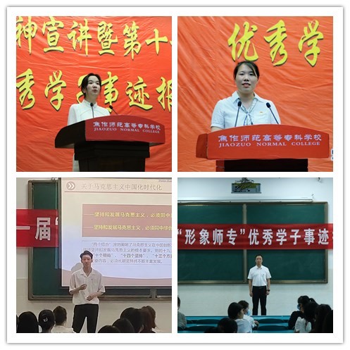 报告会上,党的二十大精神辅导员宣讲团成员音乐学院林莉萍、学前教育学院朱冬丽、美术学院吕柄润、数学学院魏欢博依据自身学习感悟作了题为《引领复兴的宏伟蓝图》《深刻领会开辟马克思主义中国化时代化新境界》《关于马克思主义中国化时代化》《深入学习宣传贯彻党的二十大精神》的宣讲。第十一届“形象师专”优秀学子代表分别从思想、学习、生活等方面进行了个人事迹宣讲,并为学弟学妹们送出美好的祝福。