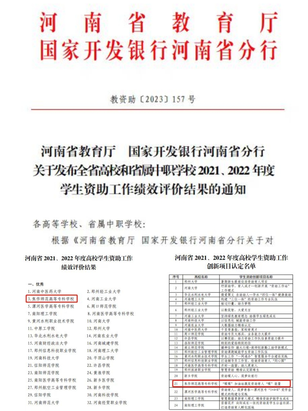 日前,河南省教育厅 国家开发银行河南省分行下发了《关于公布全省高校和省属中职学校2021、2022年度学生资助工作绩效评价结果的通知》(教资助〔2023〕157号),我校再获佳绩,被确定为“优秀”等级,名列全省155所高校第三名。我校申报的《“暖暖”加油站 激发资助育人“暖”能量》项目被认定为学生资助工作创新项目。