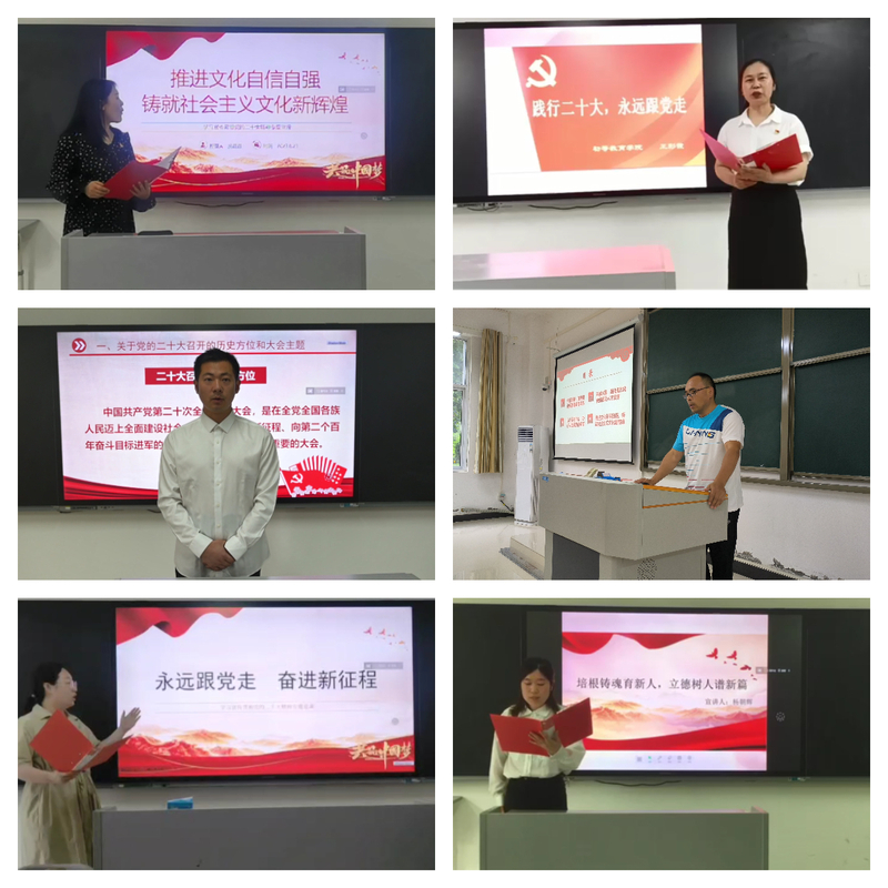 为深入学习宣传贯彻党的二十大的精神,进一步推进党的二十大精神在班级落地生根,在学生心中开花结果,2023年6月初等教育学院全体辅导员通过线上线下相结合的方式开展了党的二十大精神理论宣讲活动。